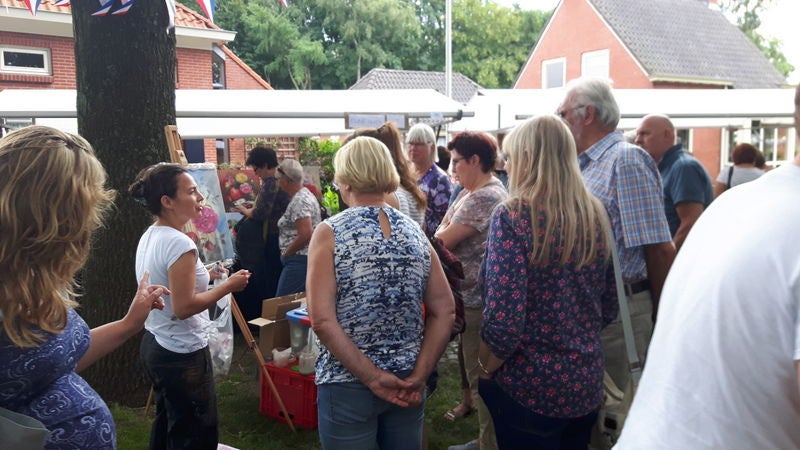 Sommige blijven een lange tijd staan om het schilderij te zien ontwikkelen en andere komen meerder keren terug en komen dan kijken hoe het schilderij gevorderd is. Jong en oud komen kijken en vele verbazen zich hoe Eline schildert. Eline heeft zich in de loop der jaren gespecialiseerd in het live schilderen van Bloemen en Landschappen op verschillende evenementen. Eline kan in overleg met u een keuze maken welke bloem(en) of welke landschap ze gaat schilderen.